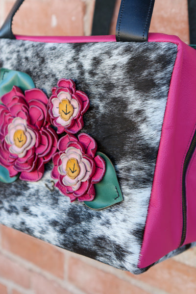 Cowhide Travel Case with Leather Sides and Leather Flowers and Leaves.