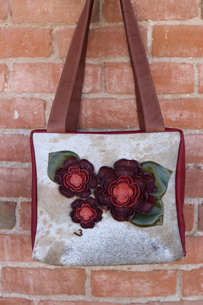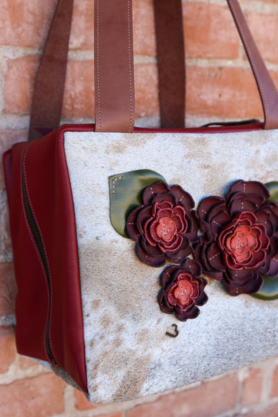 Cowhide Travel Case with Leather Sides and Leather Flowers and Leaves.