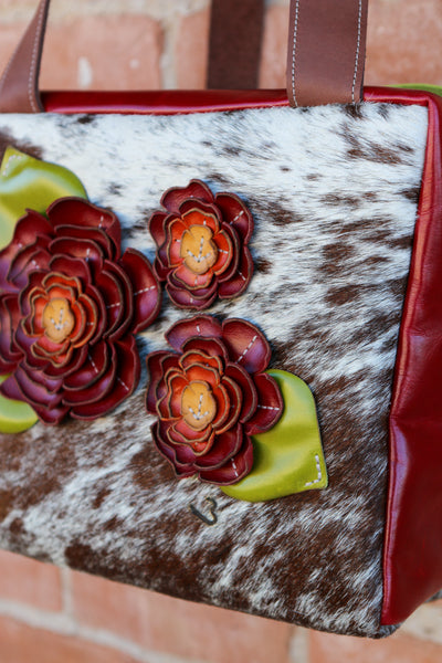 Cowhide Travel Case with Leather Sides and Leather Flowers and Leaves.