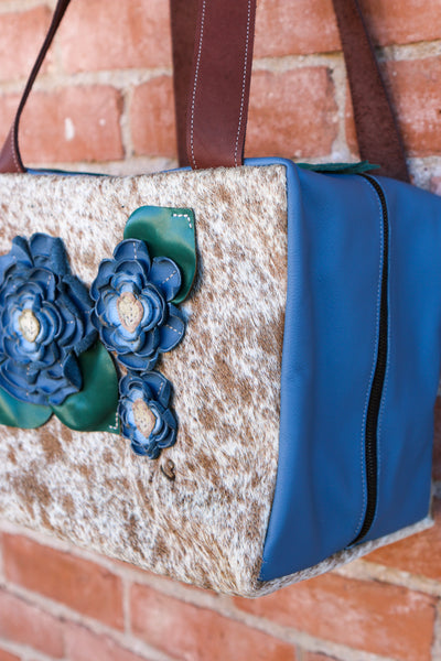 Cowhide Travel Case with Leather Sides and Leather Flowers and Leaves.