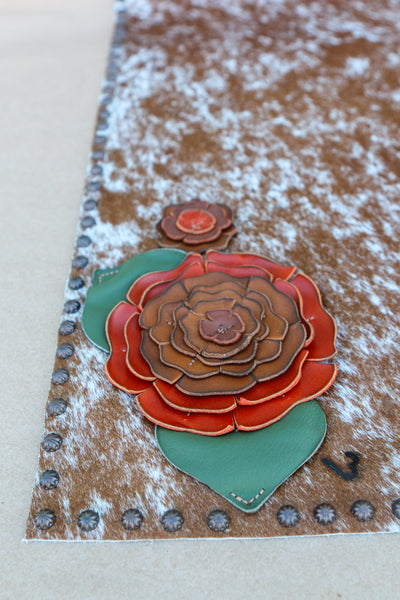 12" x 25" Rectangle Cowhide Centerpiece with Leather Flowers and Leather Leaves